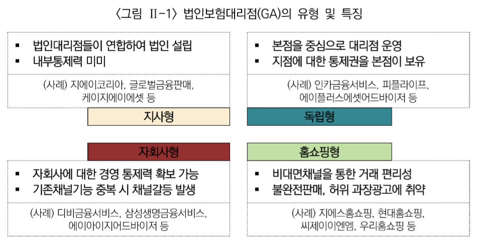 최근 보험시장 내 법인보험대리점(General Agency: GA)의 영향력이 확대되면서 전속 영업조직이 취약한 중·소형사를 중심으로 자회사형 GA 설립에 대한 검토가 이루어지고 있다. GA 채널을 신규로 설립할 경우 초기에 투자비용이 많이 소요되고 체계적인 영업망 구축 또한 쉽지 않아 경영성과가 좋지 않은 사례가 빈번히 발생하고 있다.