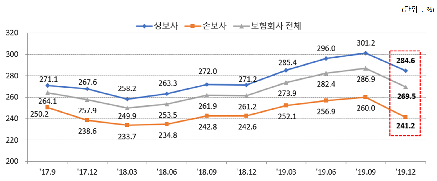 □’19.12월말 현재 보험회사의 RBC비율(=가용자본/요구자본)은 269.5%로 ’19.9월말(286.9%) 대비 17.4%p 하락