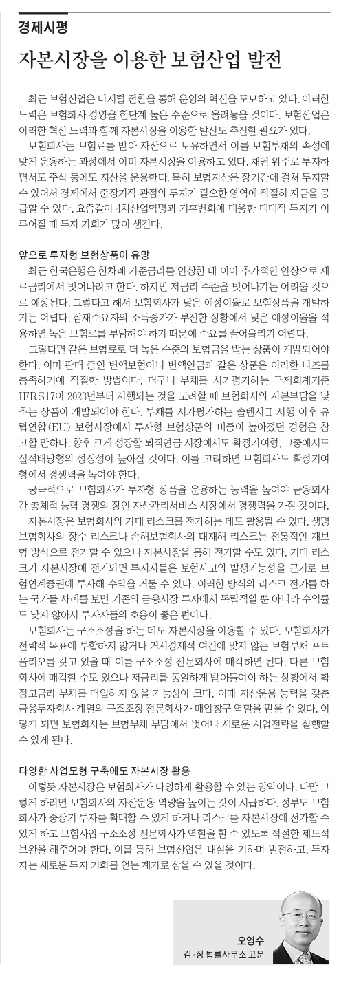 최근 보험산업은 디지털 전환을 통해 운영의 혁신을 도모하고 있다. 이러한 노력은 보험회사 경영을 한단계 높은 수준으로 올려놓을 것이다. 보험산업은 이러한 혁신 노력과 함께 자본시장을 이용한 발전도 추진할 필요가 있다.