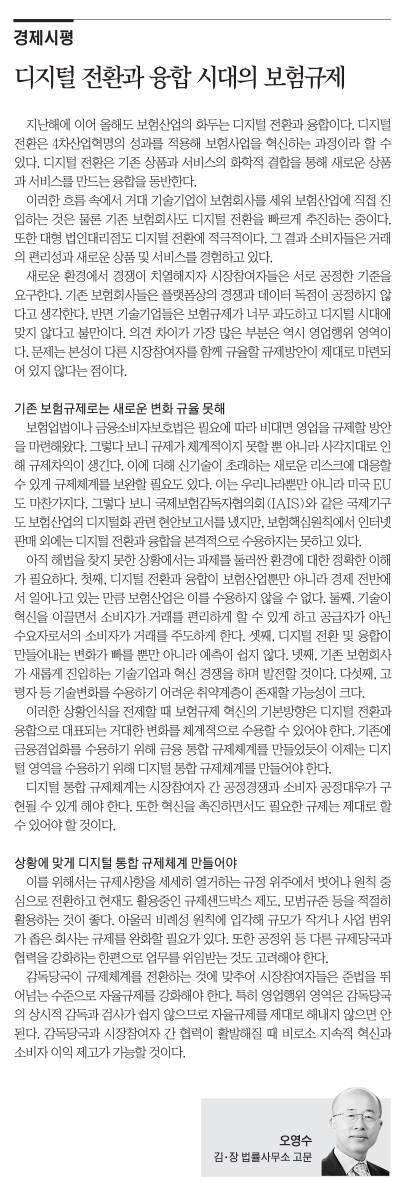 지난해에 이어 올해도 보험산업의 화두는 디지털 전환과 융합이다. 디지털 전환은 4차산업혁명의 성과를 적용해 보험사업을 혁신하는 과정이라 할 수 있다. 디지털 전환은 기존 상품과 서비스의 화학적 결합을 통해 새로운 상품과 서비스를 만드는 융합을 동반한다.
