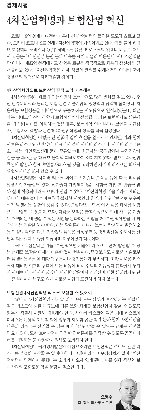 4차산업혁명이 국가경제발전의 핵심요소라면 보험산업은 적어도 관련 리스크를 적절히 보장할 수 있어야 한다. 그래야 리스크 보장장치가 없어 4차산업혁명이 발전하지 못했다는 소리가 나오지 않게 된다. 이를 위해 정부와 보험산업의 조화로운 역할 분담이 필요한 때다.